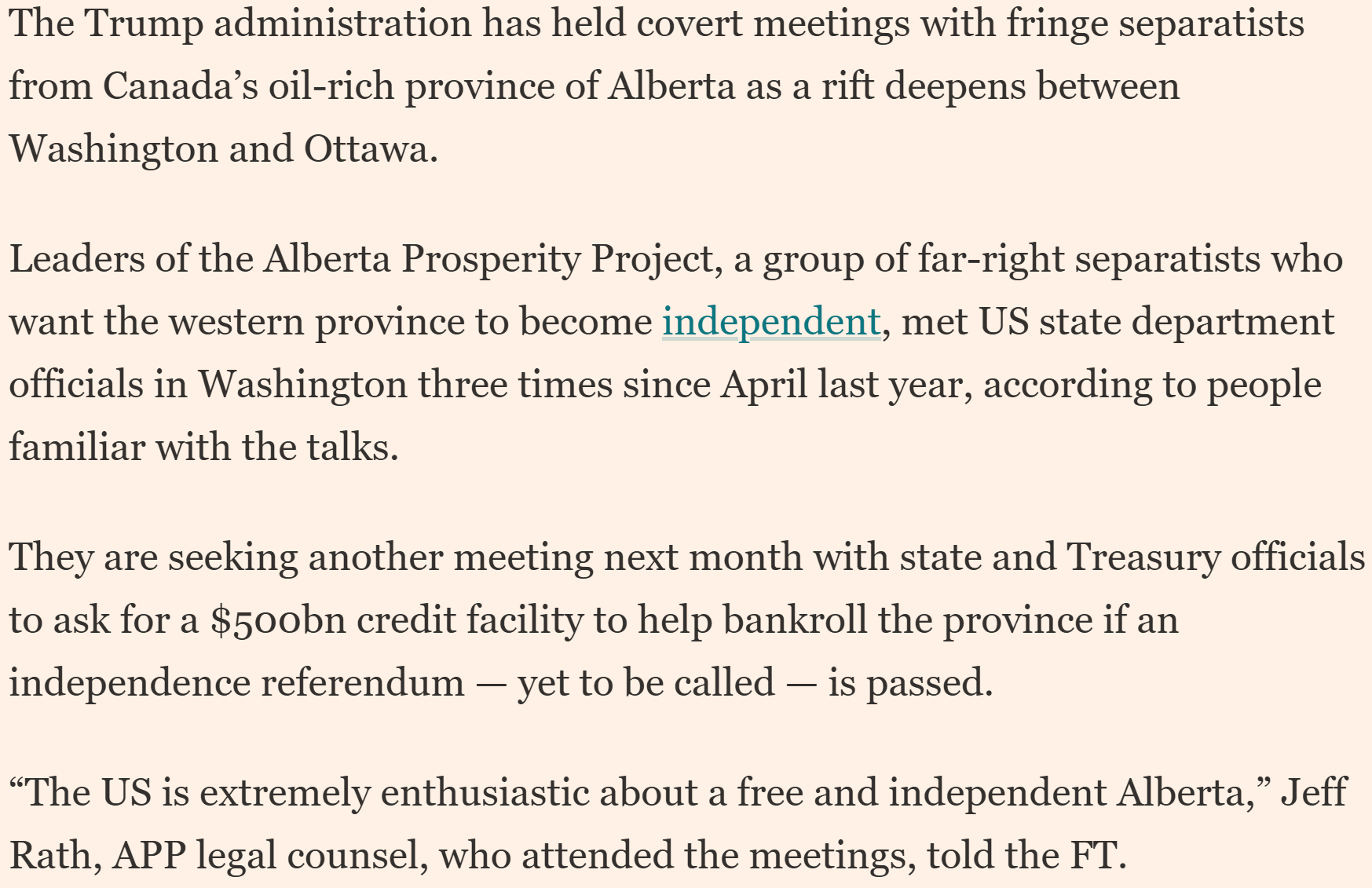 We don't only see evidence of his intention to conquer Canada in public speeches, maps he releases, threats against Canadians, and military posturing in Greenland. He's even collaborating with and funding an Alberta separatist movement. It's almost funny that he's following the fascist expansion pack to a T - build a secret police, purge the military, encourage separatist movements in a divide-and-conquer strategy, and militarily encircle target territories. From the Financial Times: